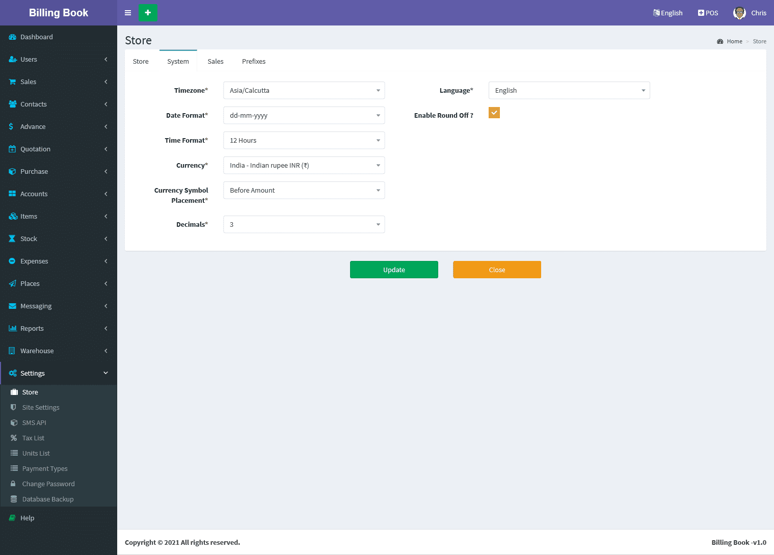 You can update the store profile information's like Store name, Phone, Mobile, Email, GST Number, VAT Number, PAN Number, Bank Details, Website link, Country, State, Postcode,Address and Invoice Logo.
