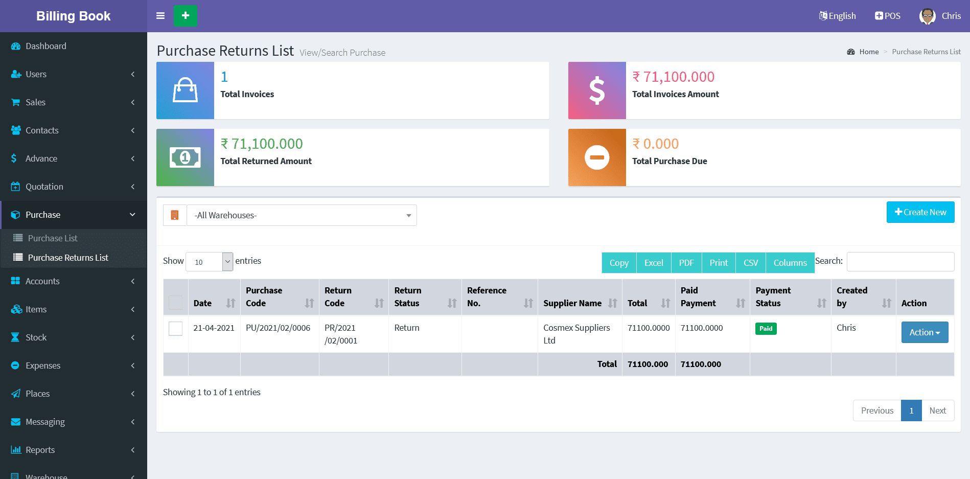 Purchase Return Report: